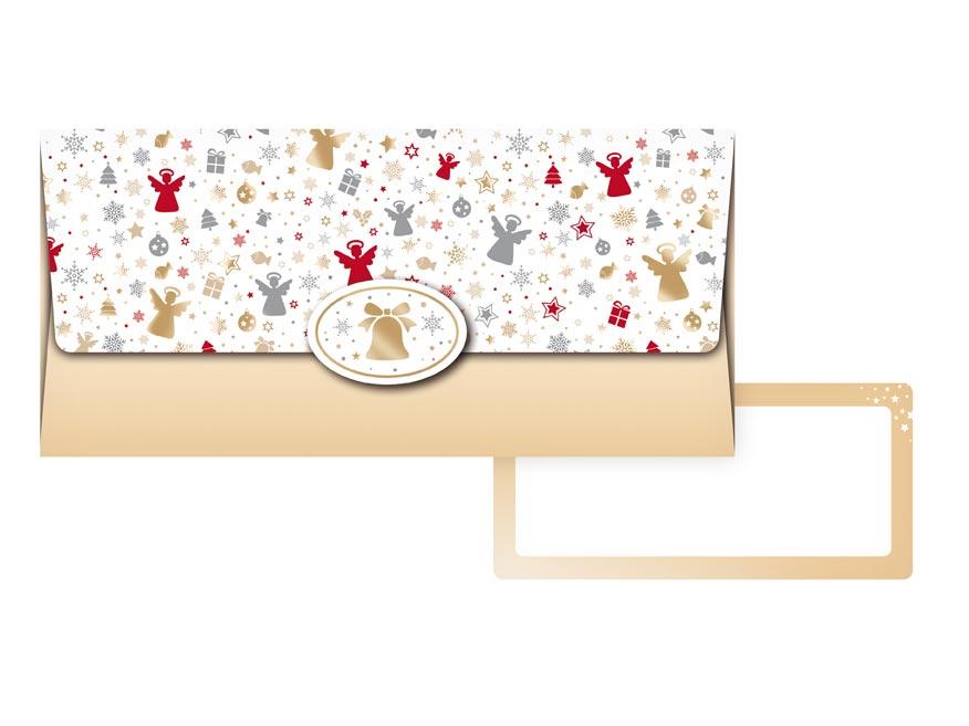 Dárková obálka na peníze s vánočním motivem a uzavíratelnou klopou. Darujte svým blízkým dárek k Vánocům v podobě obálky na peníze. Do obálky lze vložit peníze nebo dárkový poukaz. Uvnitř je kartička bez textu, na kterou můžete napsat věnování. BARVA: béžová/bílá MOTIV: andílci, dárečky, ozdoby