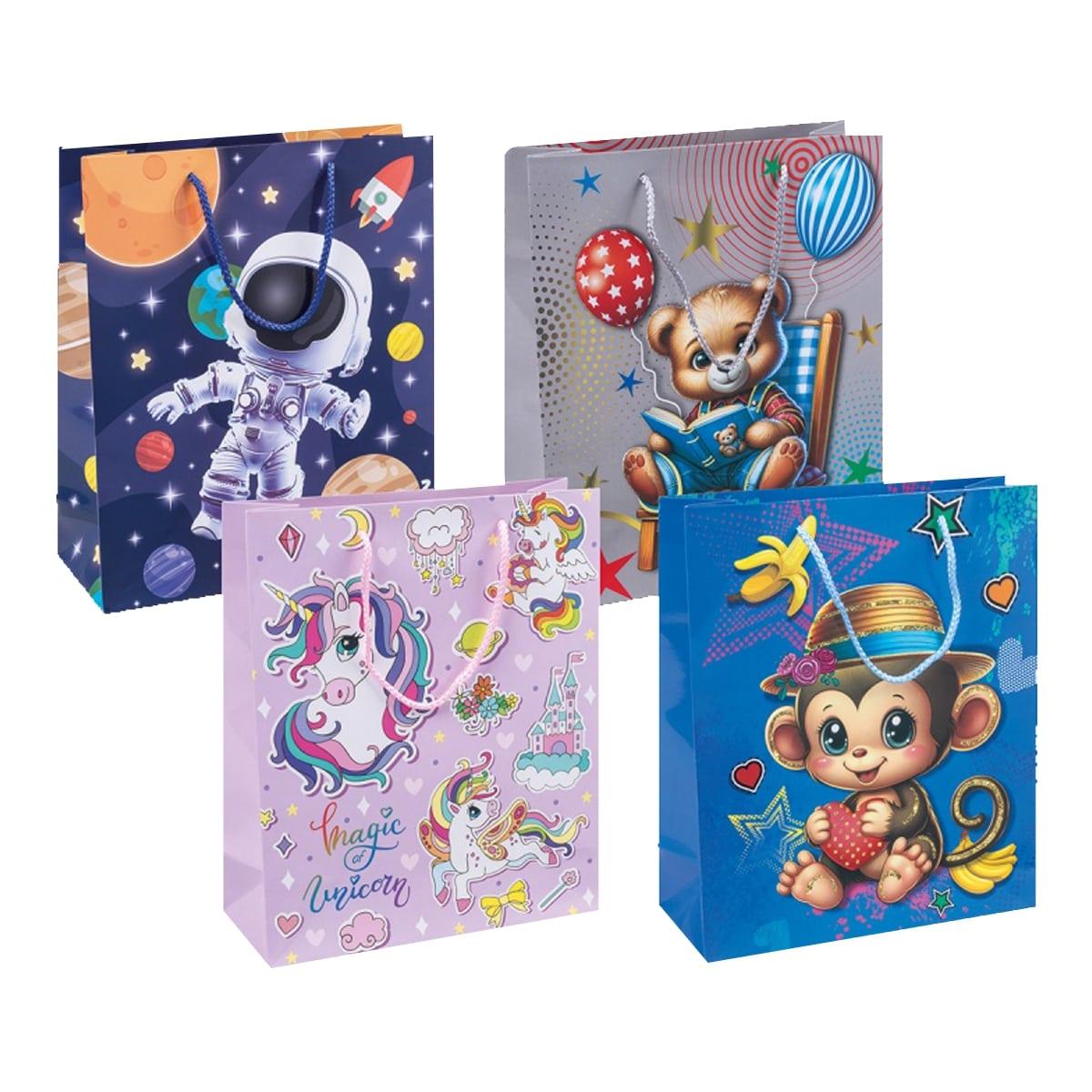 Sada kvalitních dárkových tašek, vhodná na většinu slavnostních příležitostí malých oslavenců, laminovaný lesklý povrch odolný proti oděru a poškození, atraktivní motivy, které skvěle doplní dárky pro nejmenší, barevně sladěné pevné šňůrky pro pohodlné přenášení, rozměry 25 × 30 × 10 cm, materiál lesklý laminát 210 g/m², mix 4 dětských motivů.