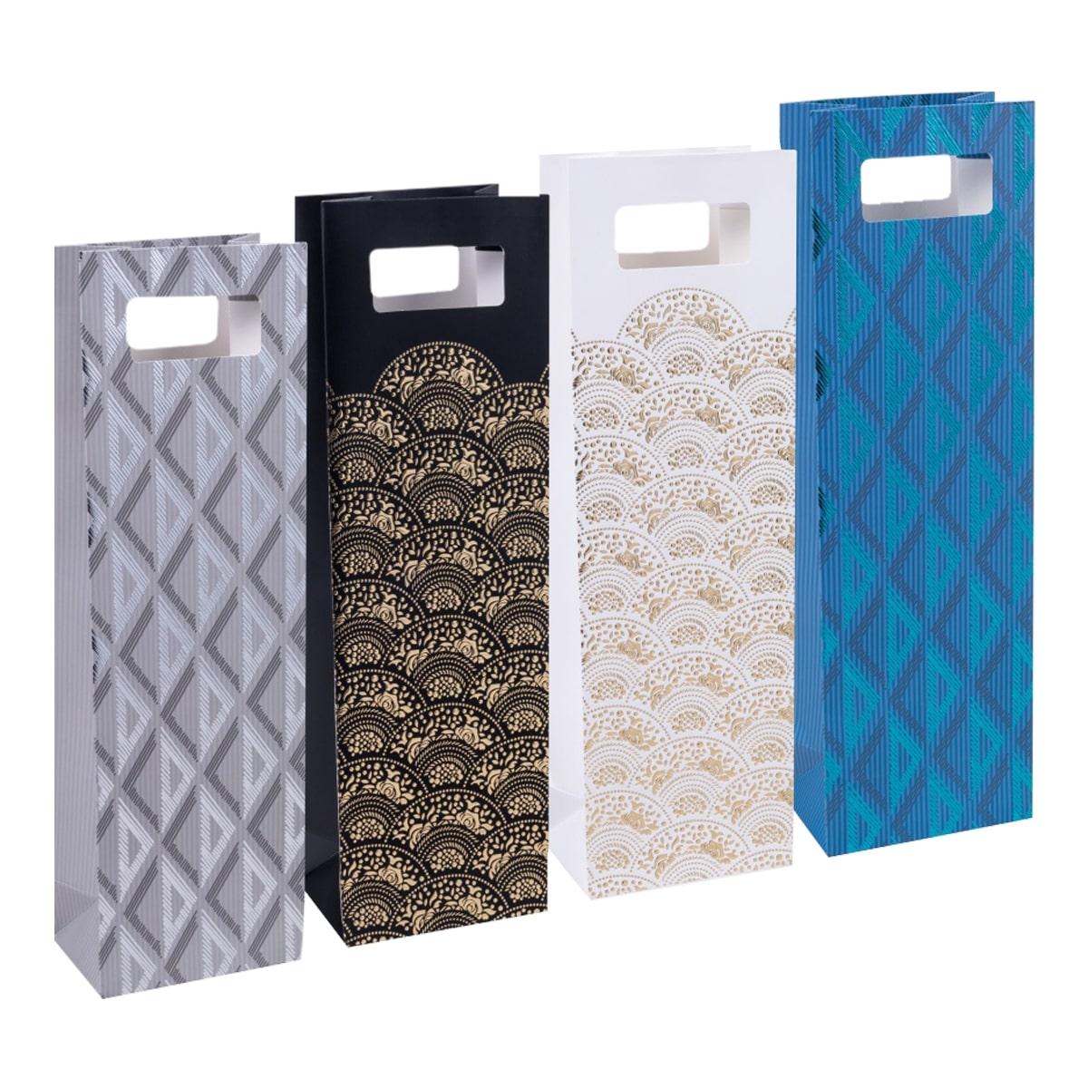 Sada kvalitních dárkových tašek určená pro balení 1 lahve vína či jiného nápoje, laminovaný matný povrch odolný proti oděru a poškození, atraktivní barvy a motivy, zesílené dno, integrovaná rukojeť s výsekem pro pohodlné držení, rozměry 12 × 41 cm, půdorys 5 × 8 cm, materiál matný laminát 210 g/m², vhodná pro většinu slavnostních příležitostí, mix 4 motivů.