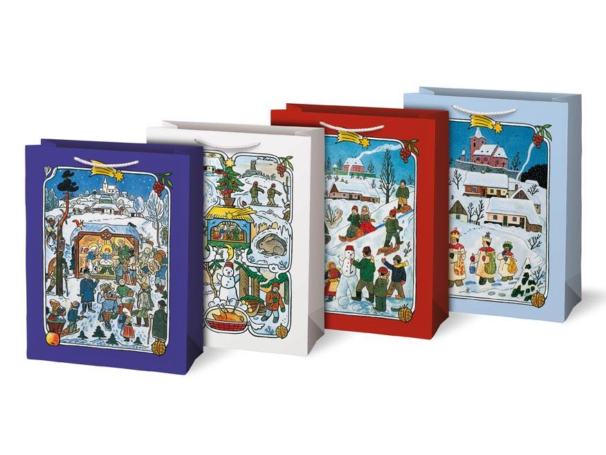 Papírová vánoční dárková taška s vánočními motivy Josefa Lady (bílá, červená, světle modrá, tmavě modrá). Každý dárek musí být v něčem zabalený. Pokud nemáte čas balit ho do balicího papíru, máme pro Vás na výběr nejrůznější dárkové tašky.Taška má pevné ucho pro snadné přenášení a štítek pro vepsání jména či přání.