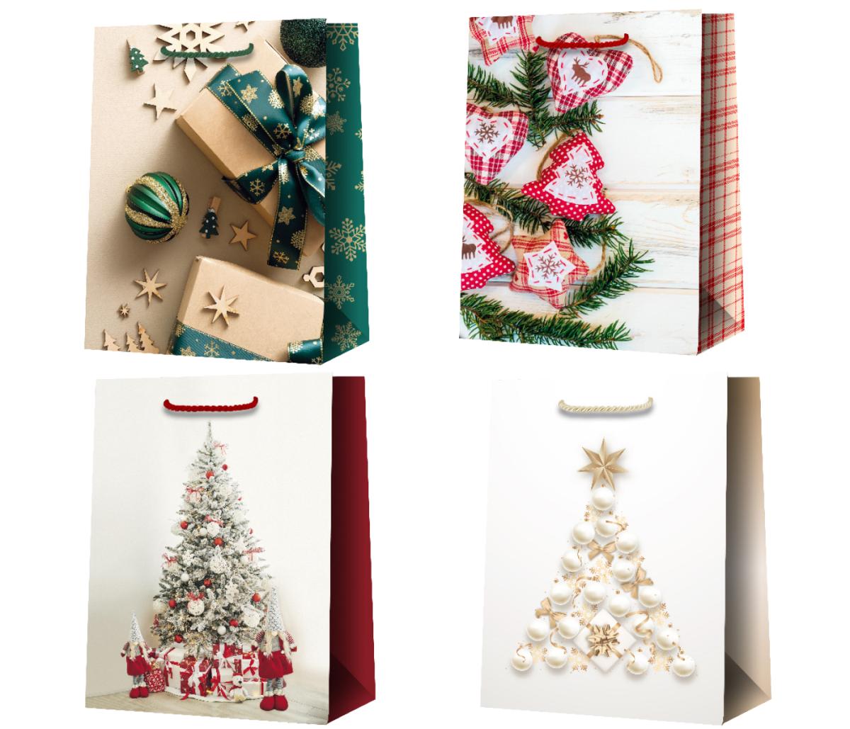 papírová dárková taška, ucha z bavlněné šňůrky, rozměry: 18 x 23 x 10cm, gramáž papíru: 128g/m², mix vánočních motivů