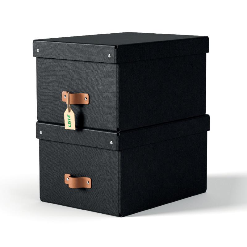 Sada dvou středně velkých kartonových krabic s víkem. 17L. Snadno sestavitelný úložný box na dokumenty A4 a další předměty. 100% recyklovaný karton. Rozměr: 270 × 200 × 370 mm.