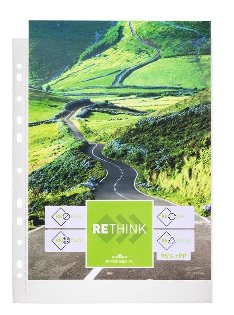 obaly na prospekty z polypropylenu s ochranou dokumentů před vyblednutím, vyrobeno minimálně z 95 % z recyklovaného plastu před použitím (průmyslový odpad, odřezky nebo zbytky z výroby), prémiová kvalita, formát A4 na výšku