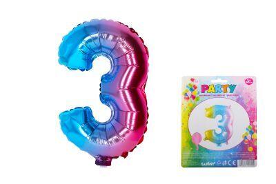 Duhový nafukovací balónek ve tvaru čísla 3 je vhodný jako doplněk na narozeninovou párty! Velikost: 40 cm