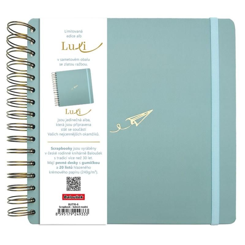 limitovaná edice scrapbooků se sametovým přebalem v moderní ledově modré barvě a se zlatým motivem Vlaštovky, jedinečná alba Luxi s krémovým papírem, kroužkovou vazbou a gumičkou pro všechna vaše tvoření, ručně vyráběná v České republice, pevné desky s gumičkou, uvnitř 40 stran 240g papíru umožňujících vlepování fotografií i psaní různými popisovači, počet stran je přizpůsoben spirále tak, aby se album i po zaplnění pohodlně uzavíralo, krásná a trvanlivá alba připravená stát se součástí vašich nejcennějších okamžiků, rozměry 210×210 mm, 20 listů
