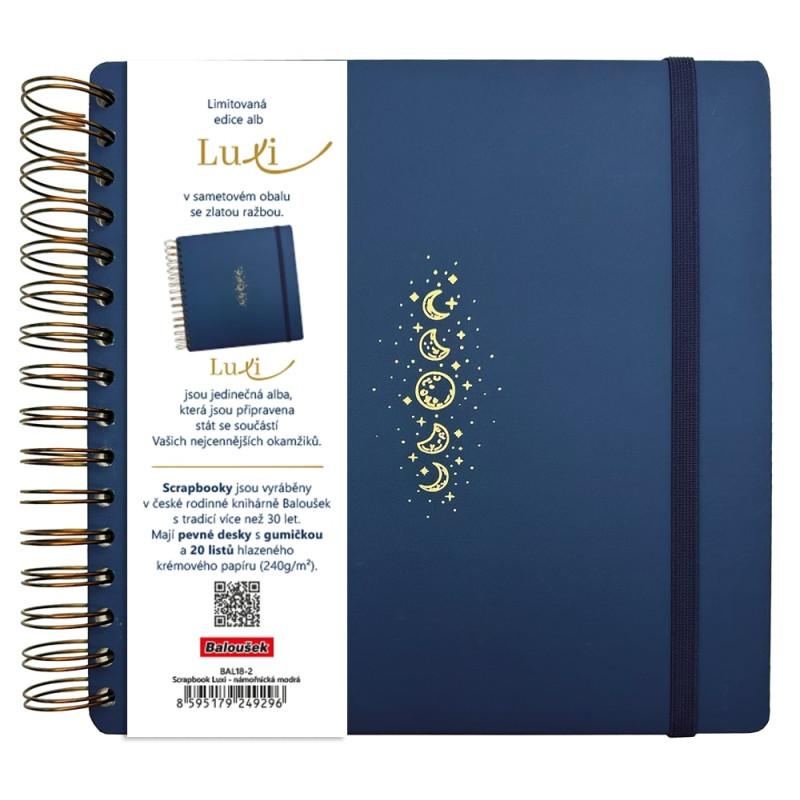 limitovaná edice scrapbooků se sametovým přebalem v moderní námořnické modré barvě a se zlatým motivem Vesmíru, jedinečná alba Luxi s krémovým papírem, kroužkovou vazbou a gumičkou pro všechna vaše tvoření, ručně vyráběná v České republice, pevné desky s gumičkou, uvnitř 40 stran 240g papíru umožňujících vlepování fotografií i psaní různými popisovači, počet stran je přizpůsoben spirále tak, aby se album i po zaplnění pohodlně uzavíralo, krásná a trvanlivá alba připravená stát se součástí vašich nejcennějších okamžiků, rozměry 210×210 mm, 20 listů