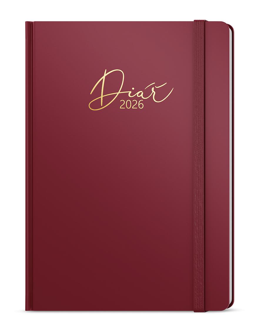 povrch diáře z matného nepoškrabatelného lamina se zlatou ražbou, rovný hřbet, zakulacené rohy, gumička v barvě diáře, , české a slovenské jmenné kalendárium, mezinárodní svátky, měsíční fáze, roční období, letní a zimní čas, místo na poznámky, formát 14,3 x 20,5 cm