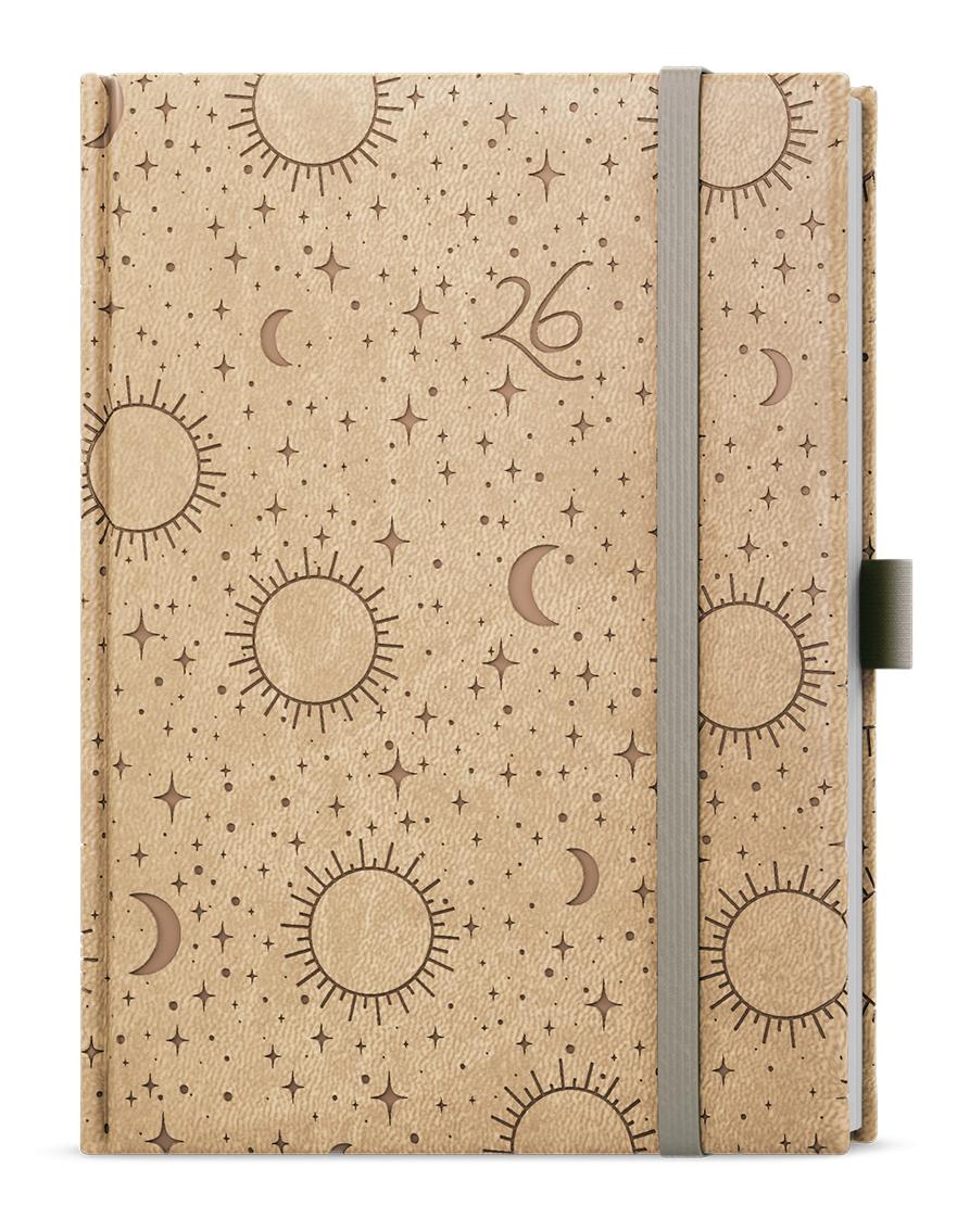 jemný hladký materiál s ražbou po celé ploše diáře, doplněný o gumičku v barvě