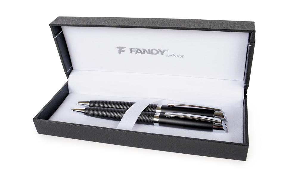 souprava kovového kuličkového pera a automatické tužky, otočný mechanismus, vyměnitelná náplň F-Parker, šíře stopy 0,7 mm, modrý inkoust (kuličkové pero), tuha 0,5 mm (automatická tužka), luxusní dárková krabička
