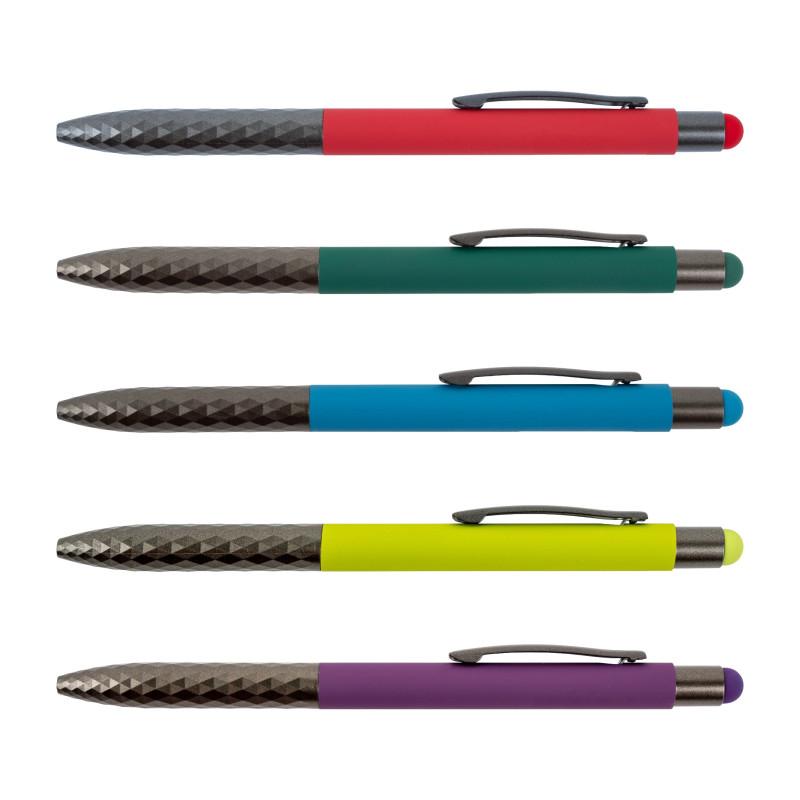 kovové kuličkové pero, stiskací mechanismus, dotykový hrot pro smartphony, tablety a dotykové notebooky s technologií kapacitních displajů, strukturovaná úchopová část pro pohodlné držení, vyměnitelná náplň F-411, inkoustu semi-gel pro příjemné psaní