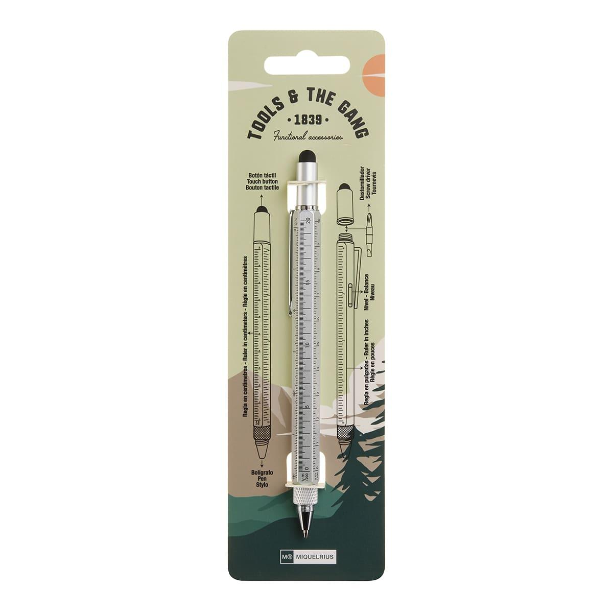 multifunkční kuličkové pero 5v1, kuličkové pero, pravítko v cm i palcích, vodováha, plochý a křížový šroubovák, dotykový stylus pro tablety a smartphony, modrá náplň, inkoust na olejové bázi, stříbrná barva, stiskací mechanika, balení v blistru, rozměry 155 × Ø 13 mm