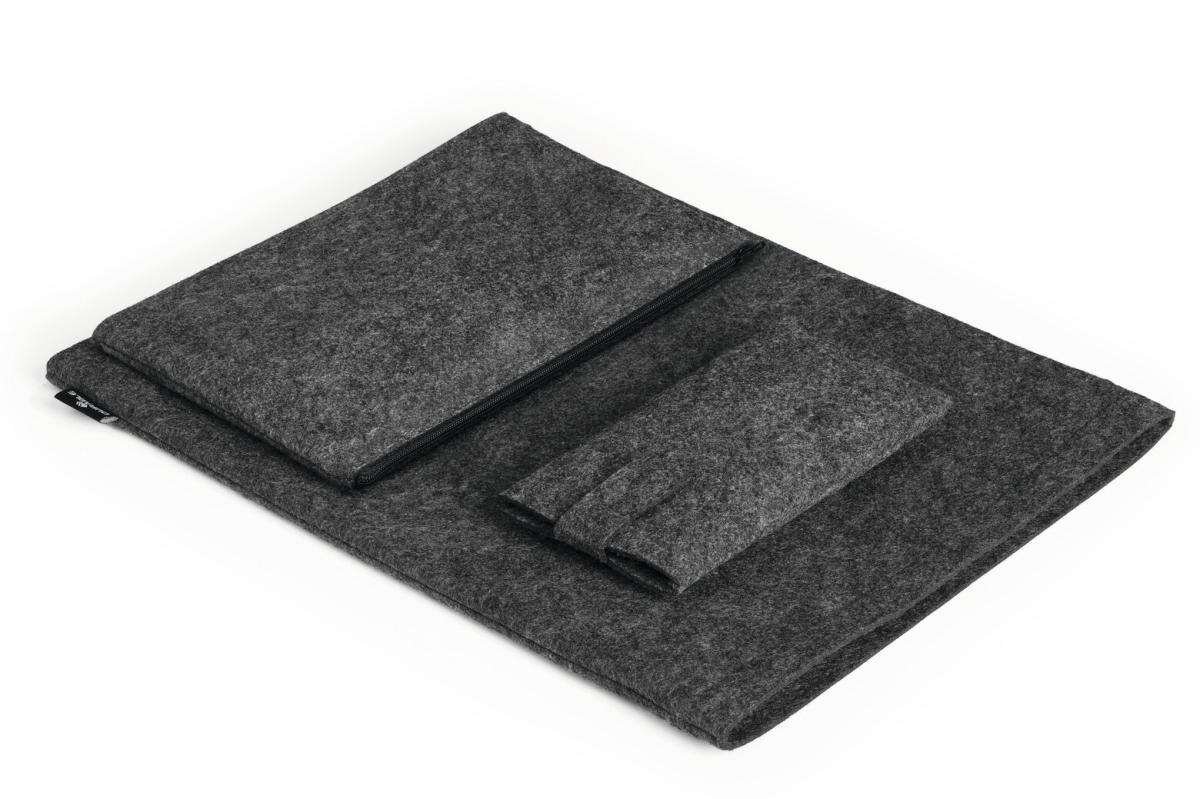 Ochranný obal pro notebooky ze 60 % recyklované PET plsti je doplněn o praktické pouzdro na příslušenství. Je lehký, přenosný a ideální pro každodenní použití – snadno se vejde do batohu, aktovky nebo kabelky. Plstěný kryt s kvalitními uzávěry poskytuje spolehlivou ochranu proti poškrábání a poškození. Poutka a cvočky bezpečně spojují kryt a pouzdro dohromady. Obal na tablet o rozměrech 32 x 25 cm i pouzdro na příslušenství (24 x 13,5 cm) lze využívat i samostatně. Obal je navržen s ohledem na životní prostředí a neobsahuje žádné plasty.