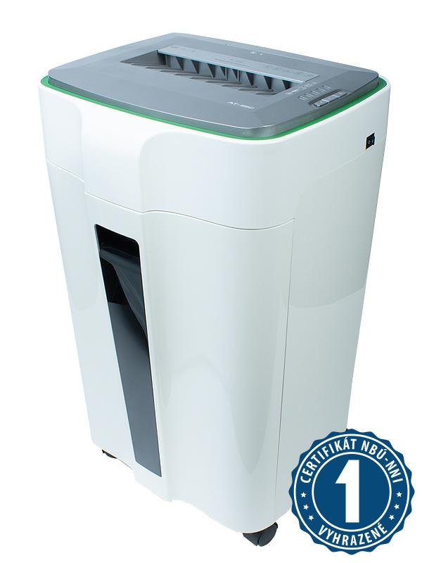 inovativní skartovací stroje do střední kanceláře s odděleným vstupem na papír a CD ve velmi dobrém řemeslném zpracování dle evropských parametrů, separovaný odpad na papír a CD, výsuvný koš pro snadné vyprazdňování, dvojitá pojistka proti přehřátí, automatický start / stop, zpětný chod, kompletní elektronická výbava – jištění otevřených dveří, plného koše, přetížení okamžitým zastavením stroje, nový typ motoru z velmi tichým chodem, pojezdová kolečka, objem koše: 38 l, AT-66C - velikost řezu 4 x 20 mm, stupeň utajení 3, kapacita 22 listů A4/70g, šířka vstupu 240 mm, rozměry 667 x 404 x 350 mm, hmotnost 24 kg , certifikát NBÚ – důvěrné, AT-66MC - velikost řezu 2 x 10 mm, stupeň utajení 4, kapacita 15 listů A4/70g, šířka vstupu 240 mm, rozměry 667 x 404 x 350 mm, hmotnost 25 kg , certifikát NBÚ – tajné