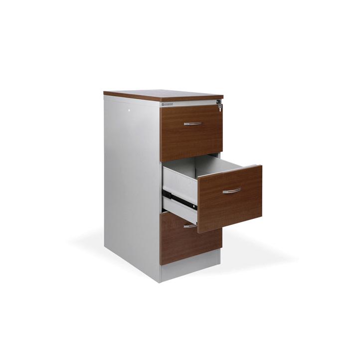 kovová kartotéka s čelem v dekoru dřeva (výběr viz vzorník na další straně) pro závěsné pořadače formátu A4, centrální uzamykání všech zásuvek, plný 100% výsuv zásuvek, přesné teleskopické vedení, kuličková ložiska pro lehký a tichý chod, zařízení proti převážení kartotéky, zábrany proti vypadnutí zásuvek, nosnost jedné zásuvky 40 kg