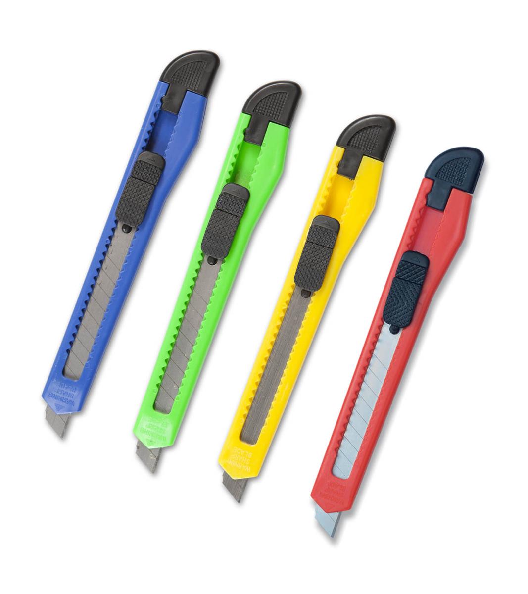 odlamovací nože s plastovým tělem v několika barvách, možnost výměny nožů, uzavírací pojistka, protiskluzový povrch