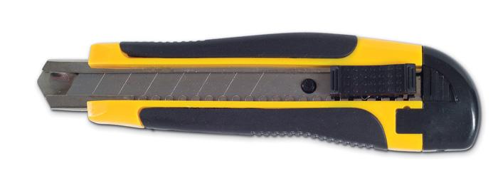 masivní odlamovací nůž s plastovým tělem a pogumovaným úchopem, kovová vodící lišta nože, různé barvy, možnost výměny nožů, uzavírací pojistka, protiskluzový povrch, šířka čepele 18mm