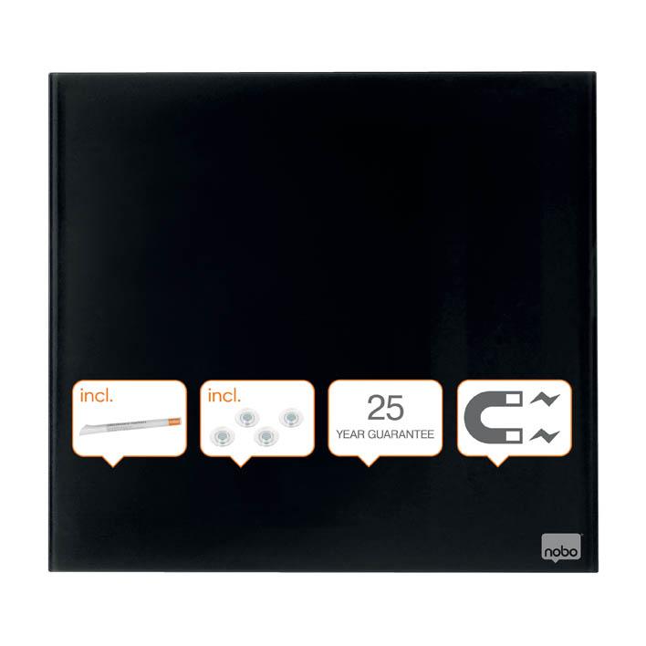 širokoúhlý formát poskytuje dostupnější psací plochu oproti klasickým skleněným tabulím, kde častokrát zůstává spodní a horní část nevyužita, stylový moderní bezrámový design, který maximalizuje využitelnou plochu na psaní, bezpečnostní tvrzené sklo s magnetickým povrchem s vynikající mazatelností a nejvyšší odolností proti šmouhám, skvrnám od inkoustu, škrábancům a promáčknutí, dodáváno s popisovači Nobo pro suché stírání a sadou extra silných magnetů pro skleněné tabule Nobo, 25 let záruka