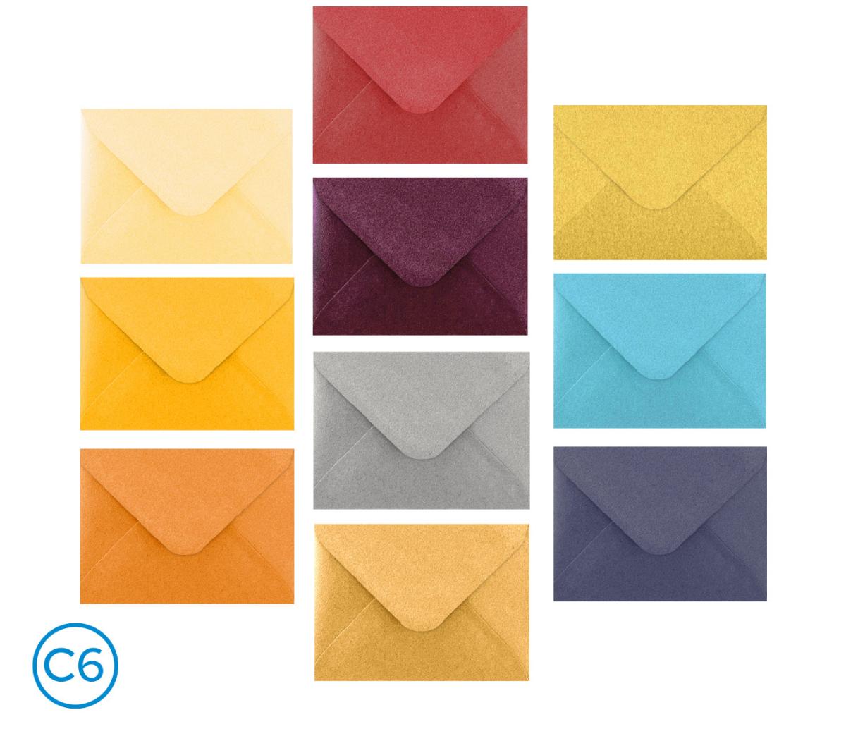 - barevné dopisní obálky, mix metalických barev, formát: C6, rozměr: 160 x 115 mm, klopa: šípová, olizová