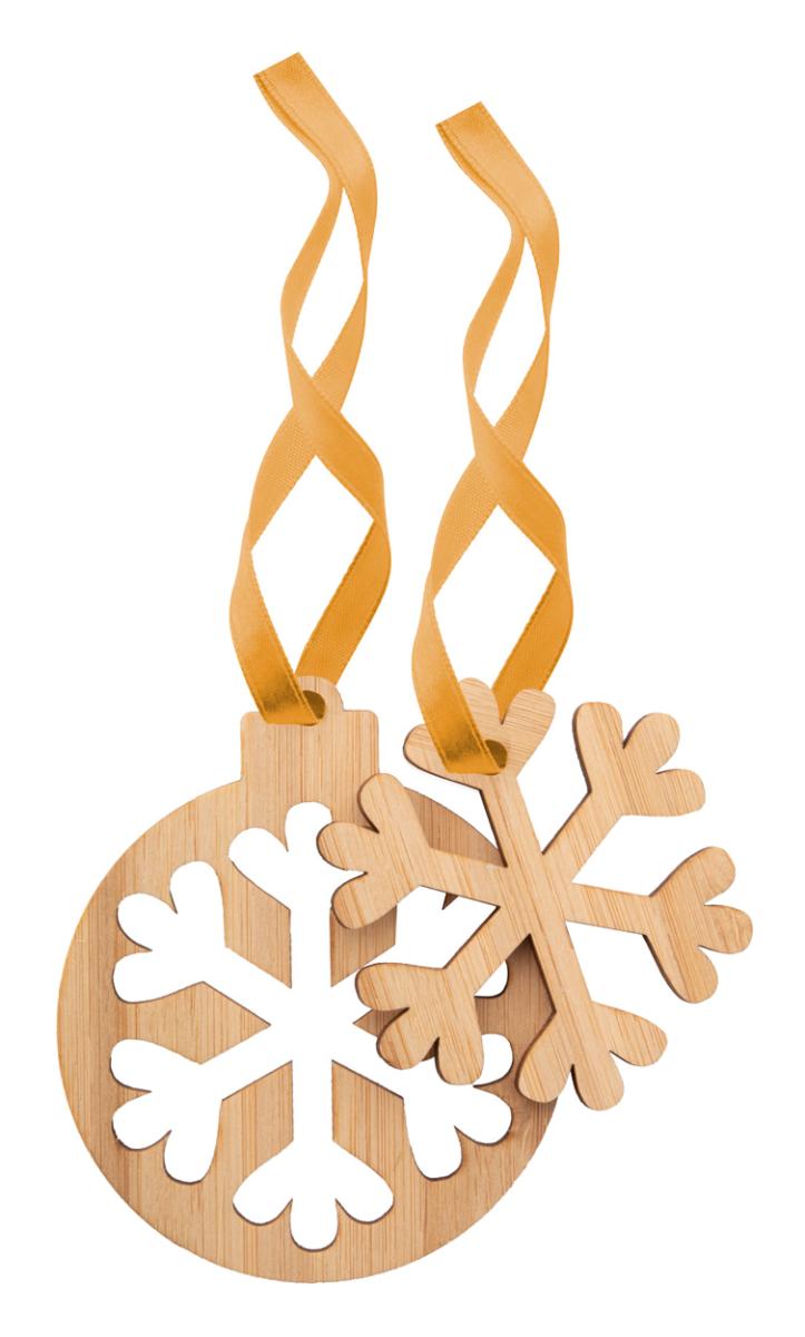 Vánoční ozdoba 2v1 z bambusové překližky se zlatou stuhou. Dodáváno s oddělenou stuhou.