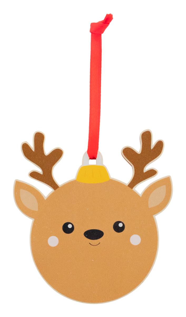 Vánoční ozdoba z březové překližky, s tištěným vánočním designem a červenou stužkou, která je dodávána zvlášť.