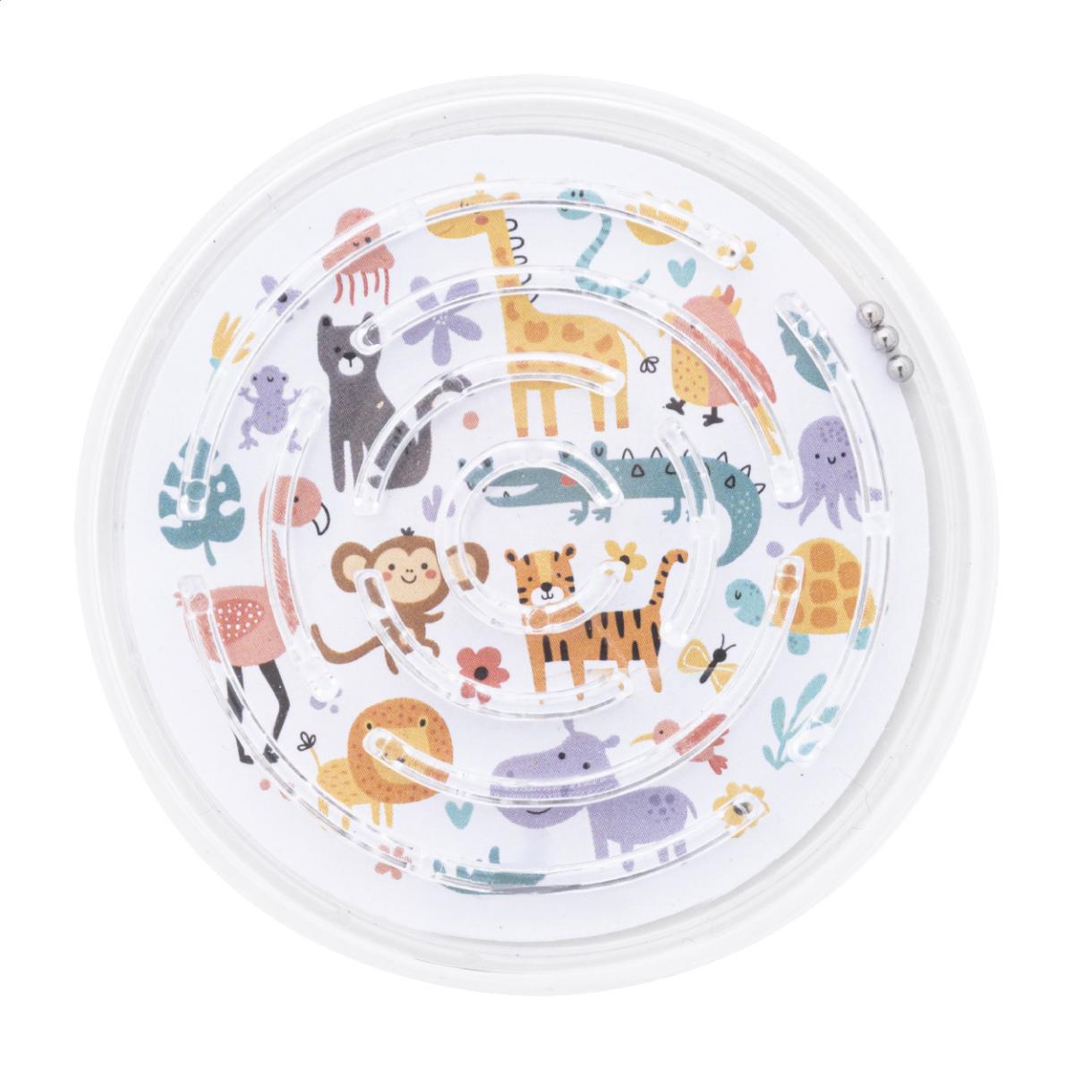 Kulatý labyrint z recyklovaného PS se třemi kovovými kuličkami. S barevnou papírovou vložkou na míru. Cena zahrnuje digitální tisk na obou stranách, nezahrnuje tiskovou přípravu. Min. mn.: 100 ks.