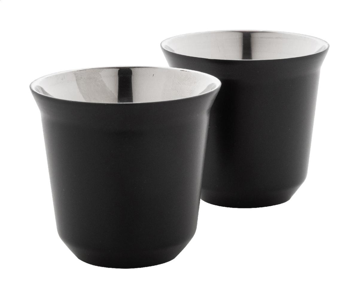 Sada 2 dvoustěnných termohrnků na espresso ve tvaru kávových kapslí z recyklované nerezové oceli, 80 ml. V krabičce z kraftového papíru.