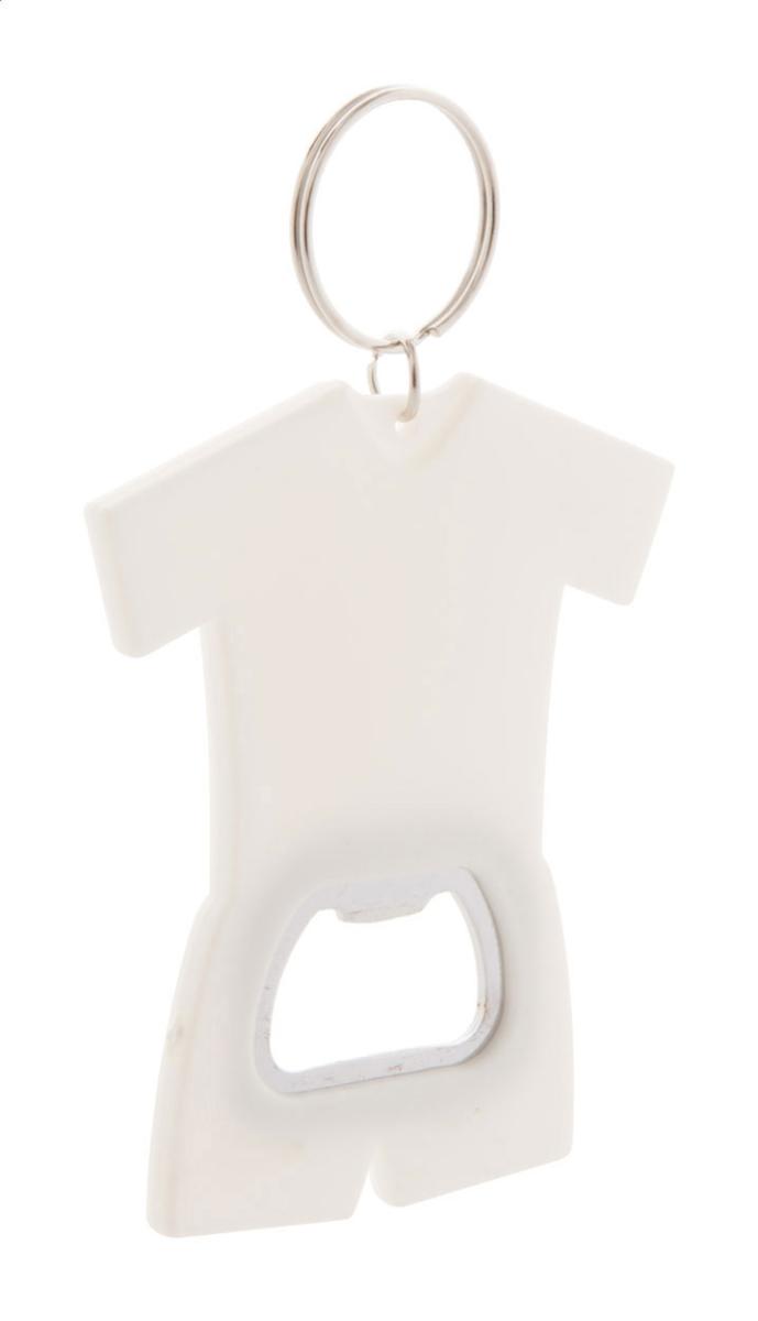 Otvírák na láhve z recyklovaného ABS plastu ve tvaru sportovního dresu s kovovým kroužkem na klíče.