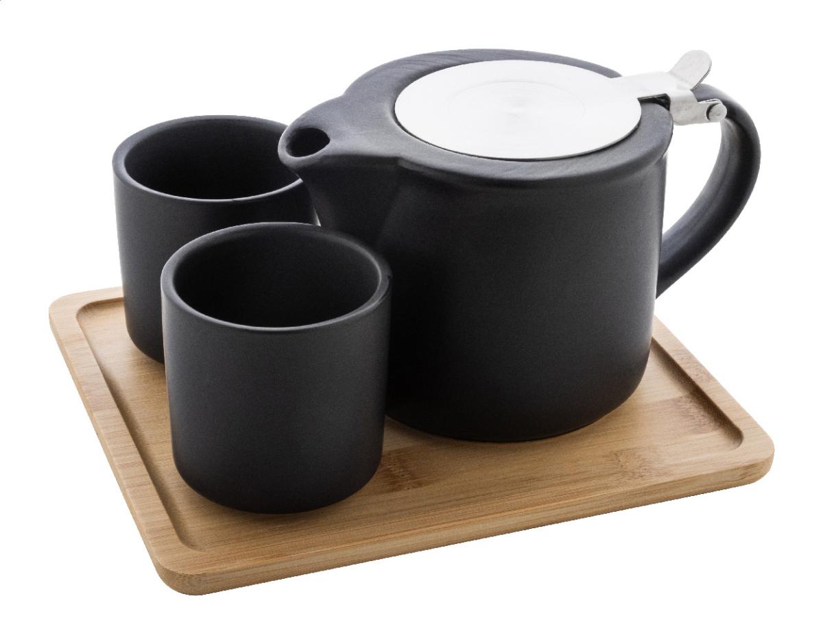 Vysoce kvalitní keramická čajová sada s matným povrchem a bambusovým servírovacím podnosem. Včetně konvice na čaj (500 ml) s víkem z nerezové oceli a sítkem na čaj a dvou šálků (150 ml). V krabičce z kraftového papíru.