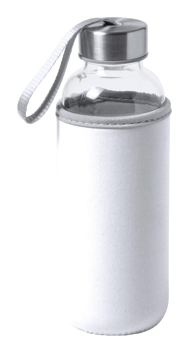Skleněná sportovní láhev s páskem na víčku a barevným neoprenovým obalem, 420 ml.