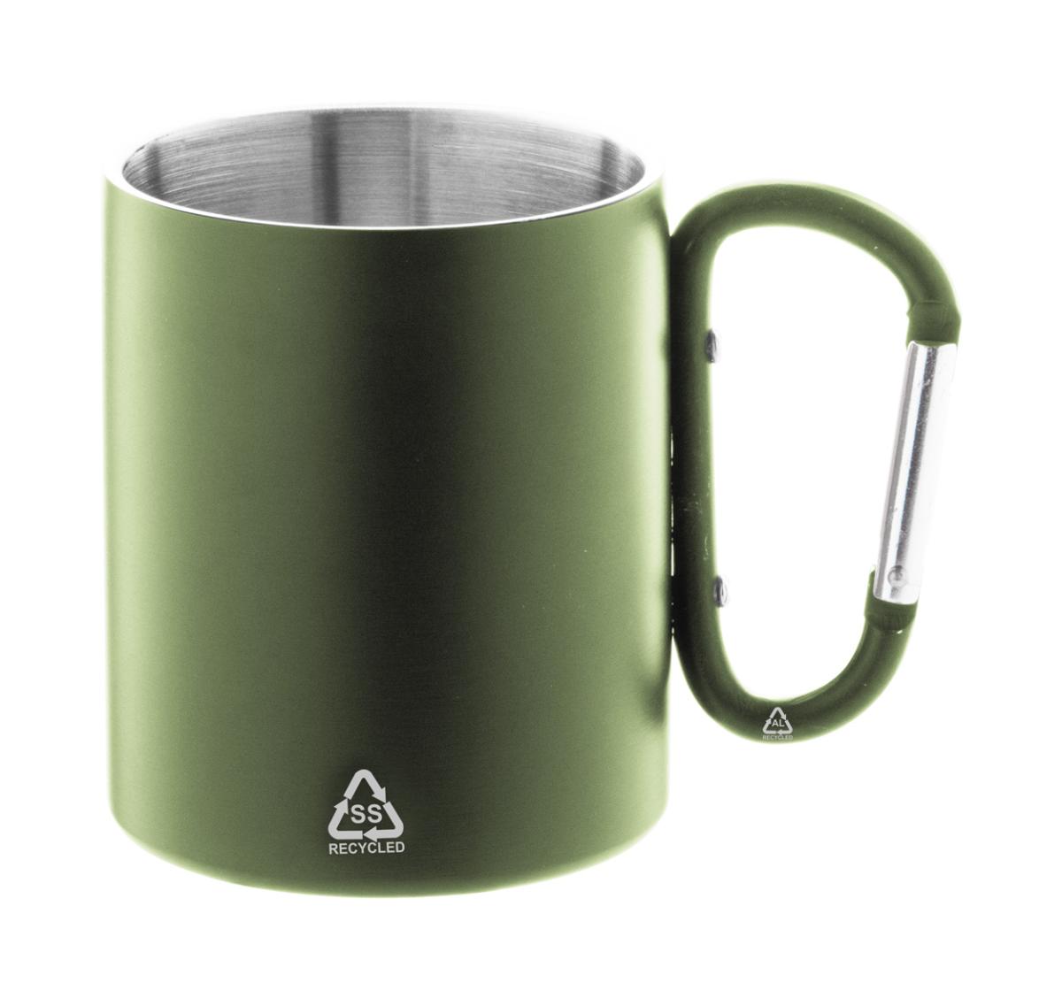 Dvoustěnný termo hrnek z recyklované nerezové oceli s karabinou z recyklovaného hliníku v odpovídající barvě. 300 ml. V kraftové papírové krabici.