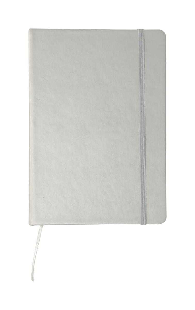 Poznámkový blok se 100 listy, záložkou a gumičkou.