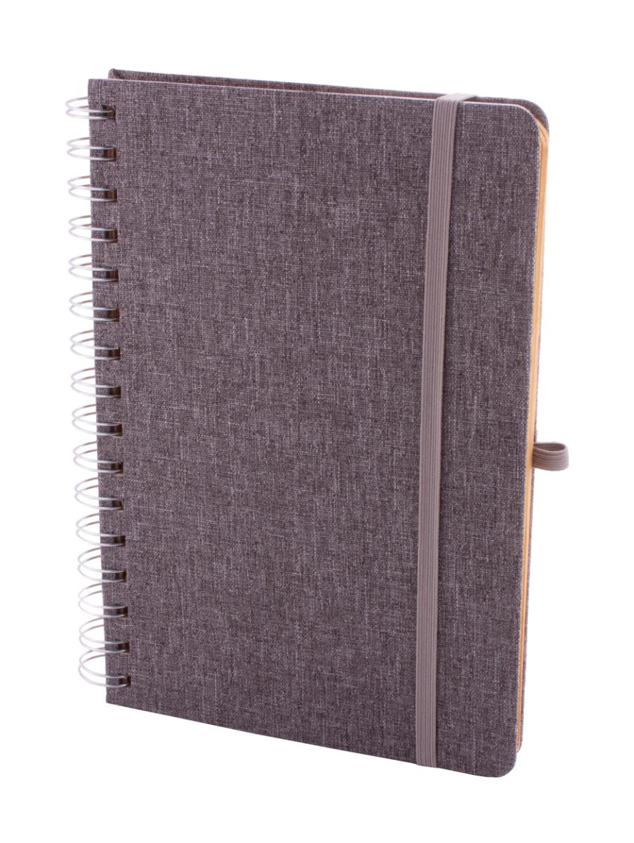 Spirálový nblok A5 s deskami potaženými polyesterem RPET s plastovým držákem na mobil a tablet z pšeničné slámy. Se 70 linkovanými listy z recyklovaného kraftového papíru, gumičkou a držákem na pero.