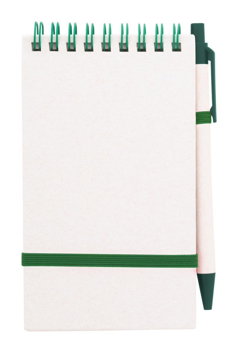 Spirálový blok A6 s deskami z recyklovaného z kartonu na mléko s pevnou vazbou a 70 linkovanými listy. Se spirálovými kroužky ve stejné barvě, gumičkou a poutkem na pero. Včetně recyklovaného kartonového papíru na mléko a recyklovaného ABS plastového kuličkového pera s modrou náplní.