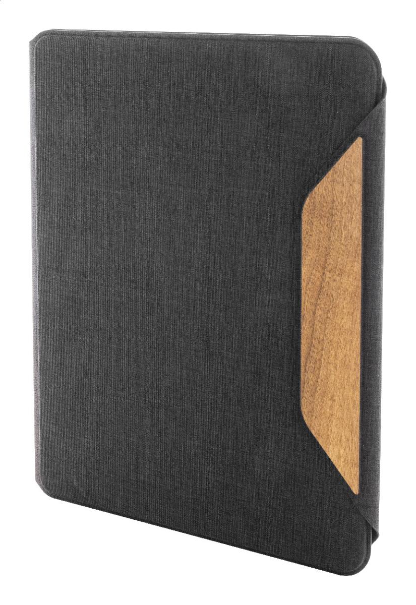 Složka na dokumenty A4 z RPET polyesteru s několika vnitřními kapsami a magnetickým zapínáním s detaily z ořechového dřeva. S linkovaným blokem z recyklovaného papíru s 20 listy.