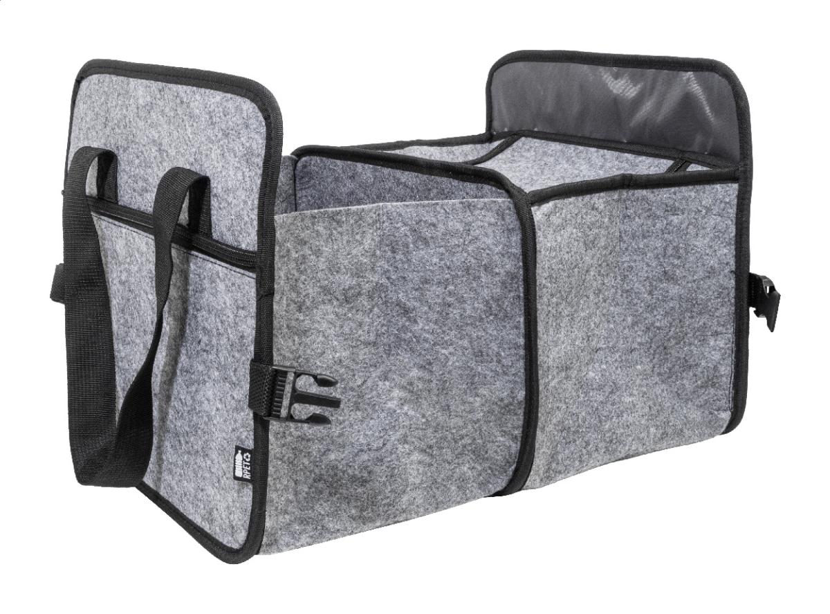 Skládací organizér do kufru auta z plsti RPET s přední kapsou na zip, dlouhými uchy a bočními přezkami pro pohodlné uložení. Obsahuje jednu otevřenou úložnou přihrádku a jednu chladicí přihrádku na zip s hliníkovým polstrováním. S výrazným štítkem RPET.