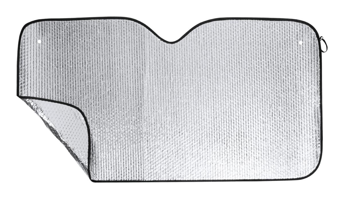 Hliníková sluneční clona do auta na přední skla, s elastickými pásky pro skládání.