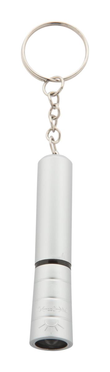 Plastová mini baterka s kovovým vzhledem s bílým LED světlem a kovovým přívěškem na klíče. Včetně knoflíkové baterie.