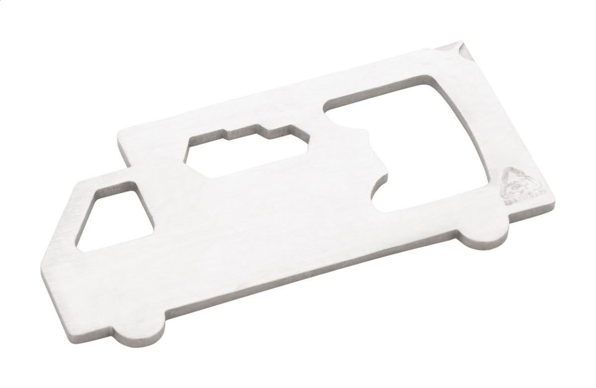 Multifunkční nářadí z recyklované nerezové oceli ve tvaru náklaďáku s otvírákem na láhve, šroubovákem Philips a 3 plochými klíči.