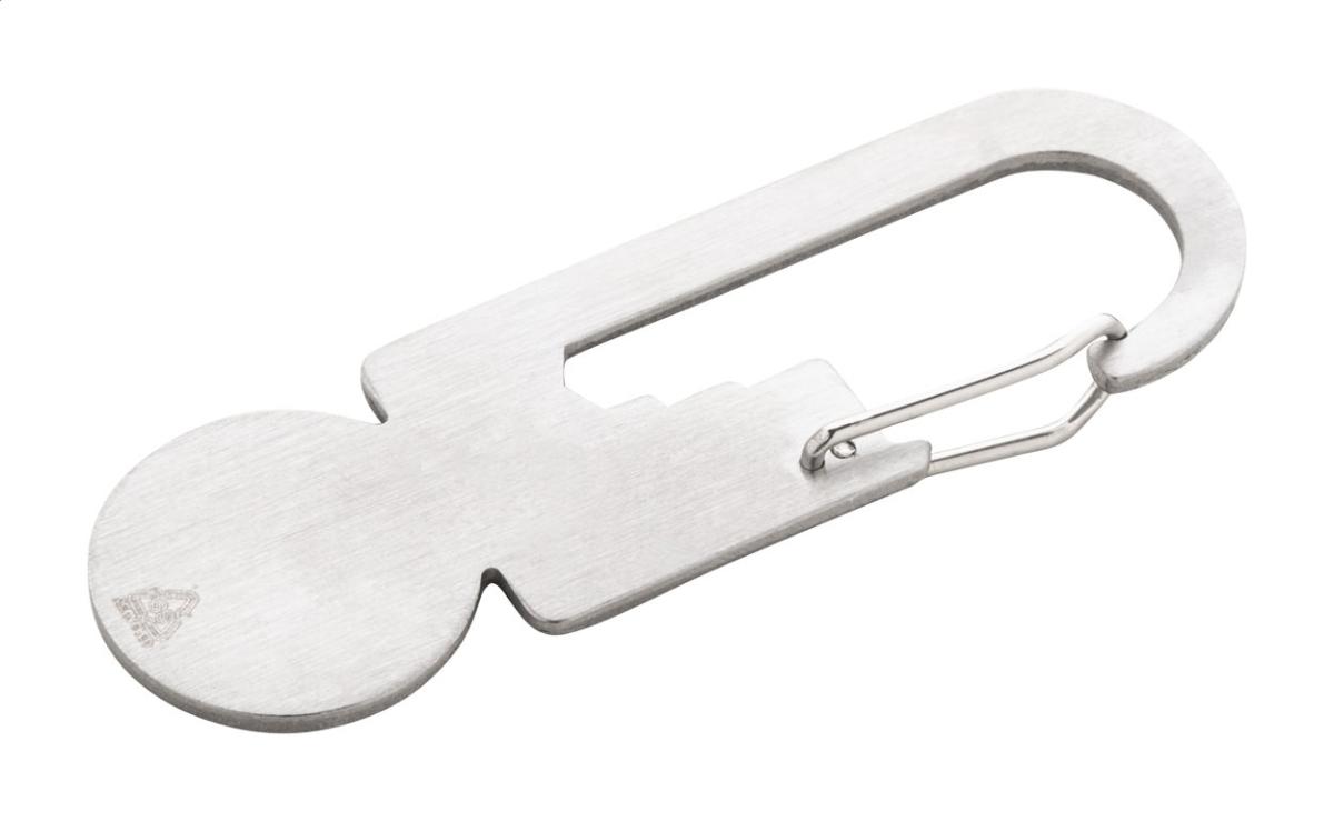 Multifunkční nástroj z recyklované nerezové oceli s karabinou, žetonem do nákupního vozíku, pravítkem a 3 plochými klíči.