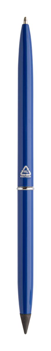 Otočné kuličkové pero 2v1 z recyklovaného hliníku a pero bez inkoustu. S modrou náplní a špičkou z kovové slitiny, která oxiduje papír. Toto pero píše podobně jako tužka a navíc je stíratelné.