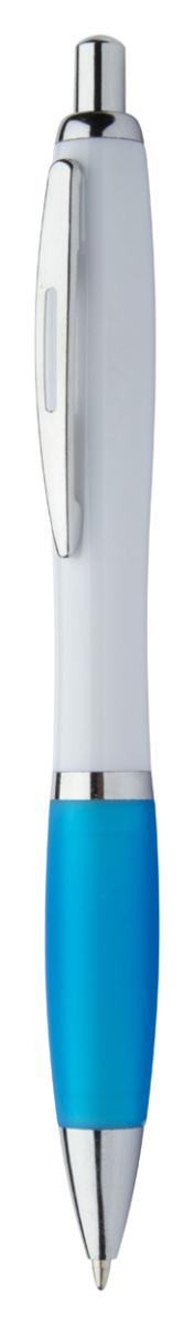 Plastové bílé kuličkové pero, s barevnou gumovou částí a s lesklými chromovanými díly. S modrou náplní.