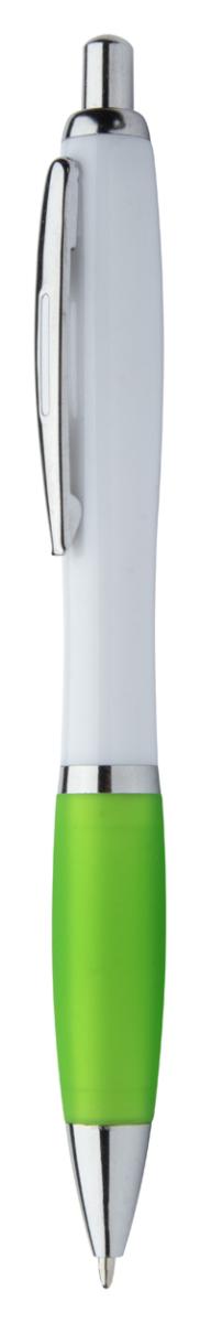 Plastové bílé kuličkové pero, s barevnou gumovou částí a s lesklými chromovanými díly. S modrou náplní.