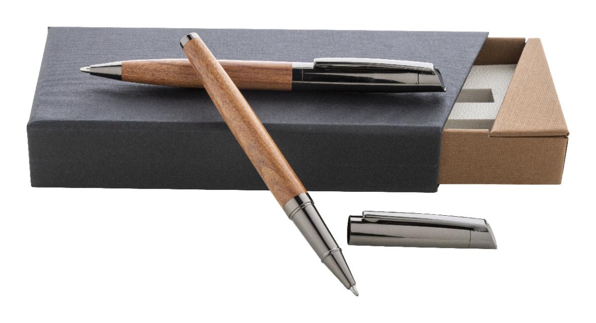 Elegantní sada kovového kuličkového pera a rolleru s dřevěným tělem a lesklými detaily v barvě antracit. Ve dvoubarevné dárkové krabičce s modrou náplní. Produkt značky André Philippe.