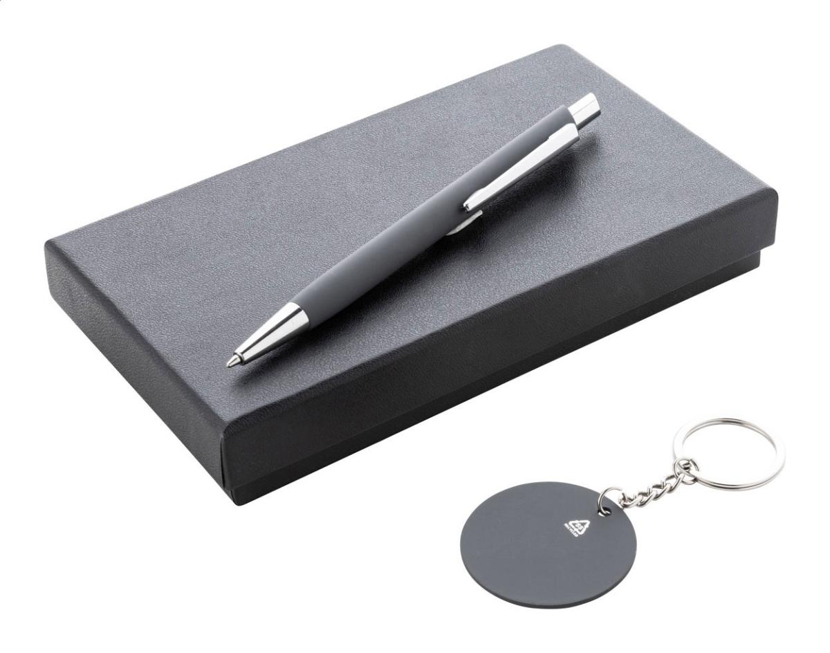 2dílná dárková sada v černé papírové dárkové krabičce. Včetně kuličkového pera z recyklovaného hliníku s pogumovaným povrchem a modrou náplní a přívěsku na klíče z recyklované nerezové oceli s pogumovaným povrchem. Obě položky mají speciální povrchovou úpravu pro zrcadlové laserové gravírování.