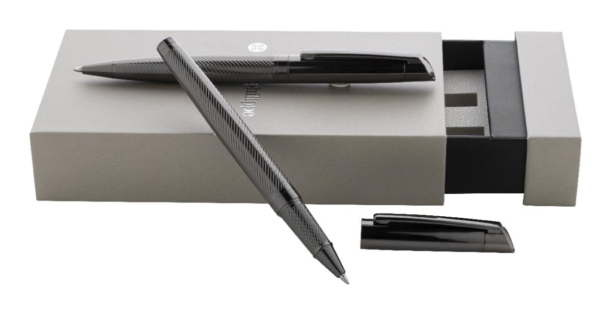 Elegantní sada kovového kuličkového pera a rolleru s diagonálně texturovaným tělem. Ve dvoubarevné dárkové krabičce s modrou náplní. Produkt značky André Philippe.