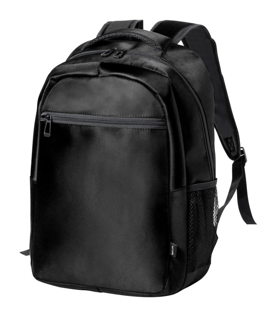 Batoh RPET s přihrádkami na zip, bočními kapsami ze síťoviny, polstrovanou kapsou na notebook (15"), popruhem na vozík, polstrovanými zády a ramenními popruhy. 420D RPET polyester s výrazným štítkem RPET.