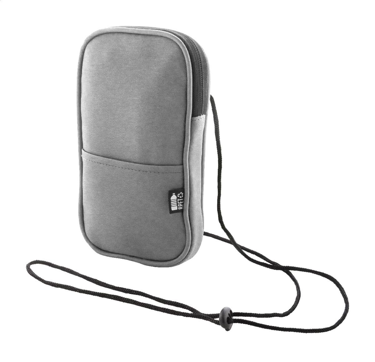 Voděodolná RPET crossbody taška na mobilní telefon s hlavní přihrádkou na zip, přední kapsou a nastavitelnou šňůrkou. Polyester RPET 600D potažený PU, s výrazným štítkem RPET.