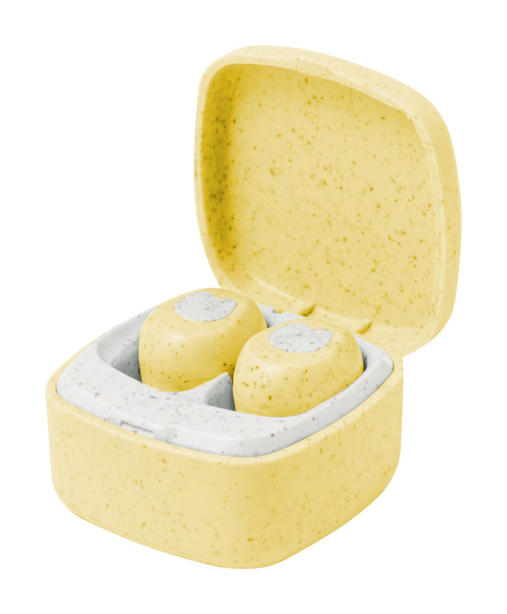 Bezdrátová bluetooth sluchátka s funkcí hands-free volání z ekologického plastu z pšeničné slámy, v nabíjecím pouzdře. Včetně USB nabíjecího kabelu.