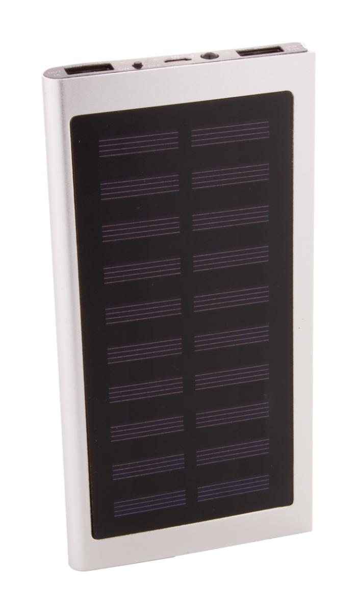 USB power banka v pouzdře z recyklovaného hliníku se zabudovanou solární nabíječkou a 4000 mAh baterií. Se 2 porty USB a 1 portem USB-C pro nabíječku. Vstupní port USB-C. Včetně USB nabíjecího kabelu.