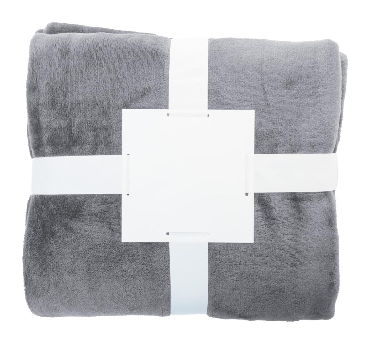 RPET flanelová fleecová deka, 260 gr/m². Zabalené do stuhy a potisknutelné papírové karty.